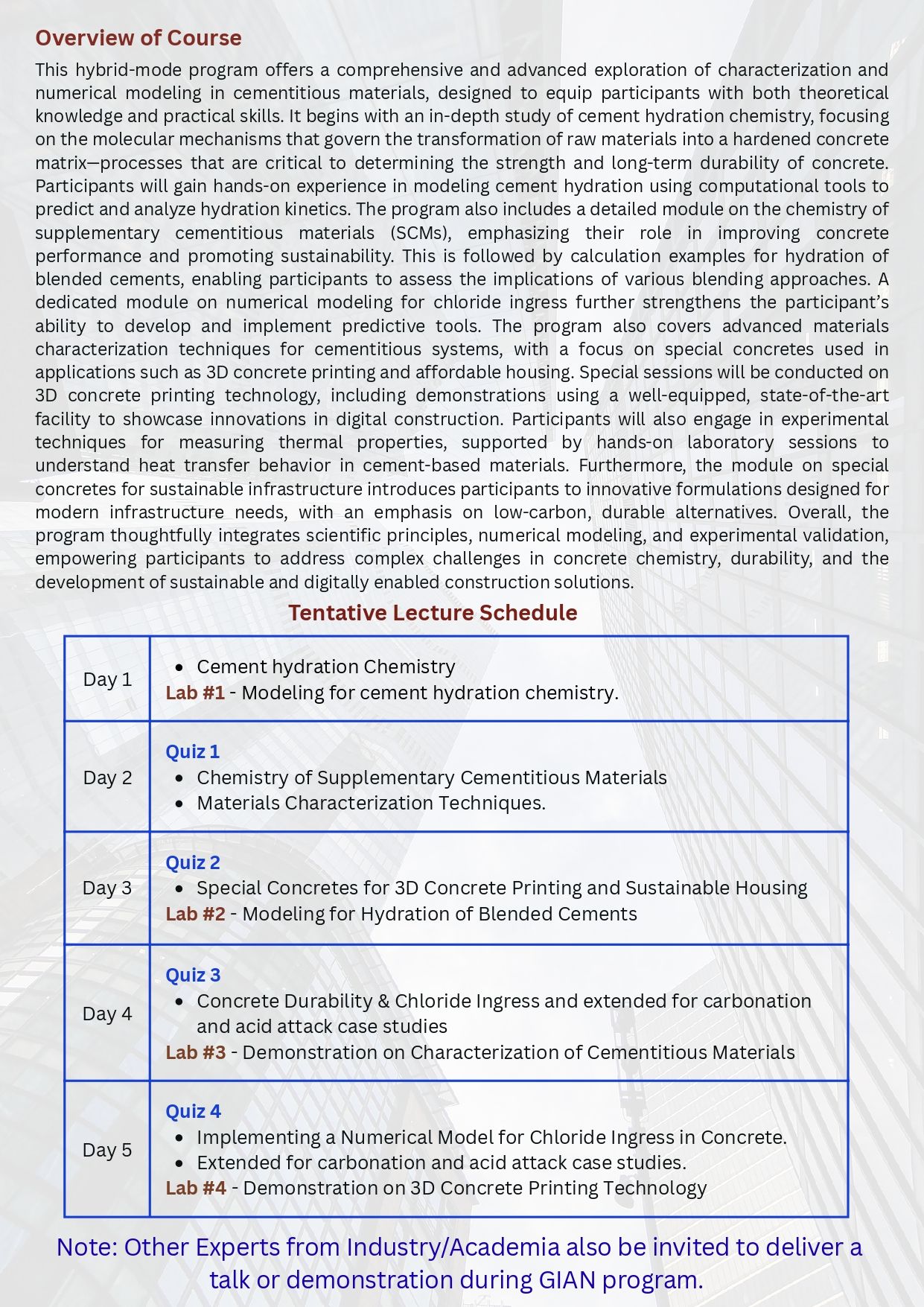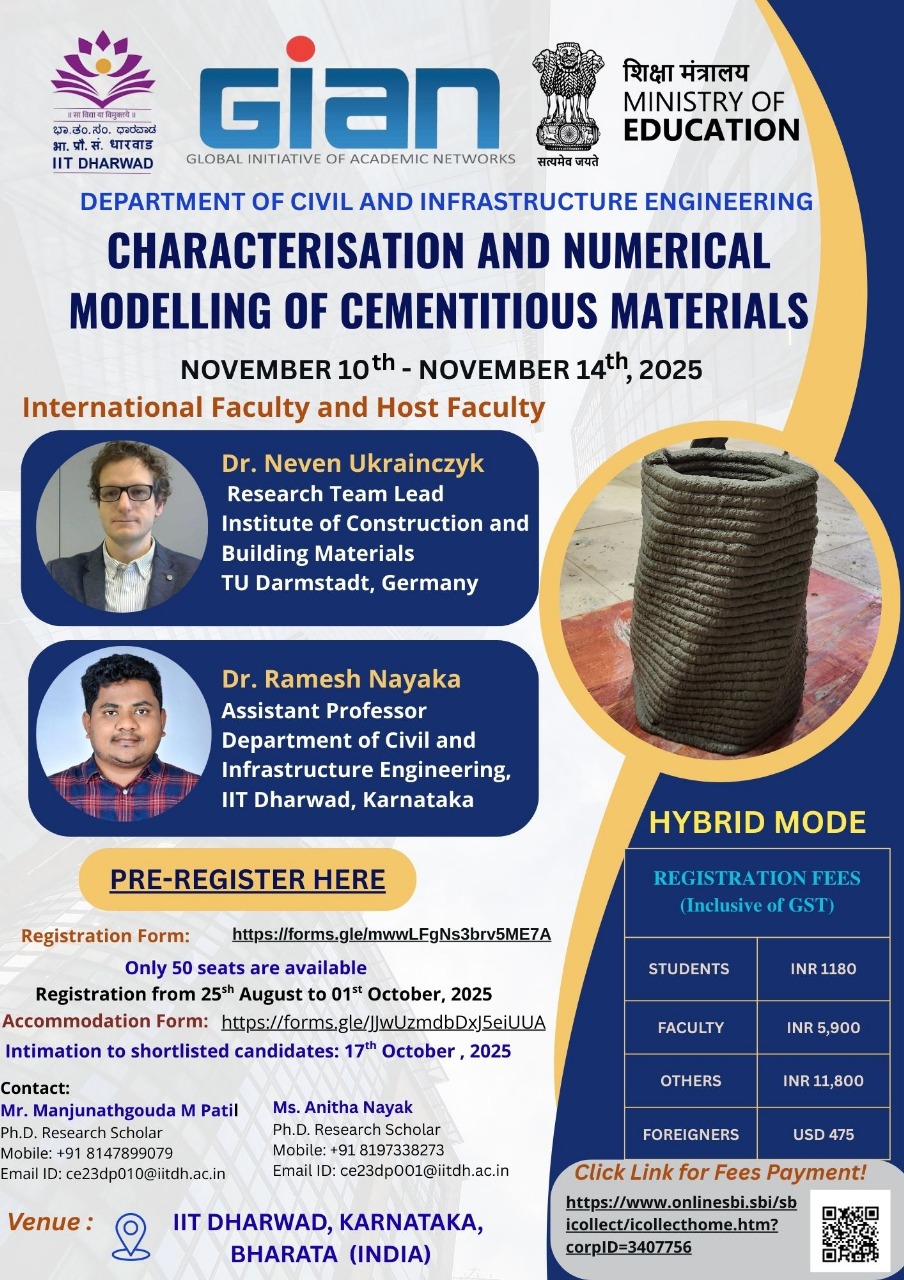 The Department of Civil and Infrastructure Engineering, IIT Dharwad, is organizing a GIAN Course on “Characterisation and Numerical Modelling of Cementitious Materials” under the Ministry of Education’s Global Initiative of Academic Networks (GIAN).