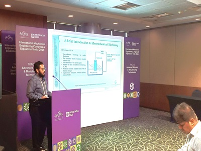 Mr. Amit Kumar, a PhD research scholar under the supervision of Prof. Vyom Sharma, Department of Mechanical, Materials & Aerospace Engineering, presented his paper at the “ASME IMECE India 2025” conference held at the Hyderabad International Convention Centre from 10–13 September. His paper, titled “Numerical Study for Anode Shape Prediction with Different Tool Designs in Electrochemical Milling of Titanium Alloy,” focused on the numerical modelling of electrochemical milling to observe the effect of tool shape on the titanium alloy. ASME IMECE is a leading platform that provides an opportunity to interact with global experts, researchers, and industry professionals in mechanical and manufacturing engineering.