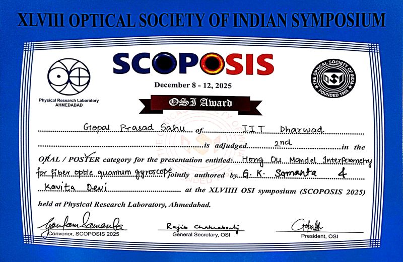 Mr. Gopal Prasad Sahu, Research scholar, Department of physics, has been awarded with the 2nd Best Poster Presentation Award for his presentation on "Hong Ou Mandel Interferometry for Fiber Optic Quantum Gyroscope", at the SCOPOSIS 2025