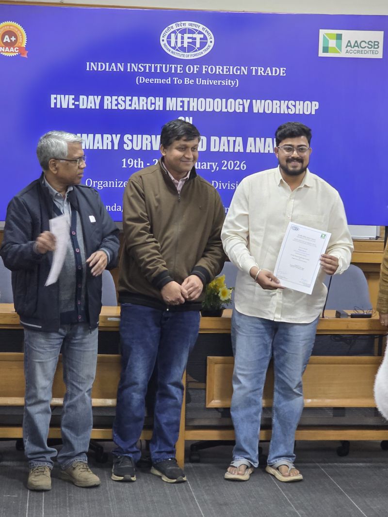 Mr. Rahul Hosuri, Department of Humanities, Economics, Arts and Rural Technologies (HEART), participated in the Five-Day Research Methodology Workshop on Primary Survey and Data Analysis, organized by the Economics Division of the Indian Institute of Foreign Trade (IIFT), New Delhi, from 19–23 January 2026 at IIFT Bhawan, Qutab Institutional Area, New Delhi.