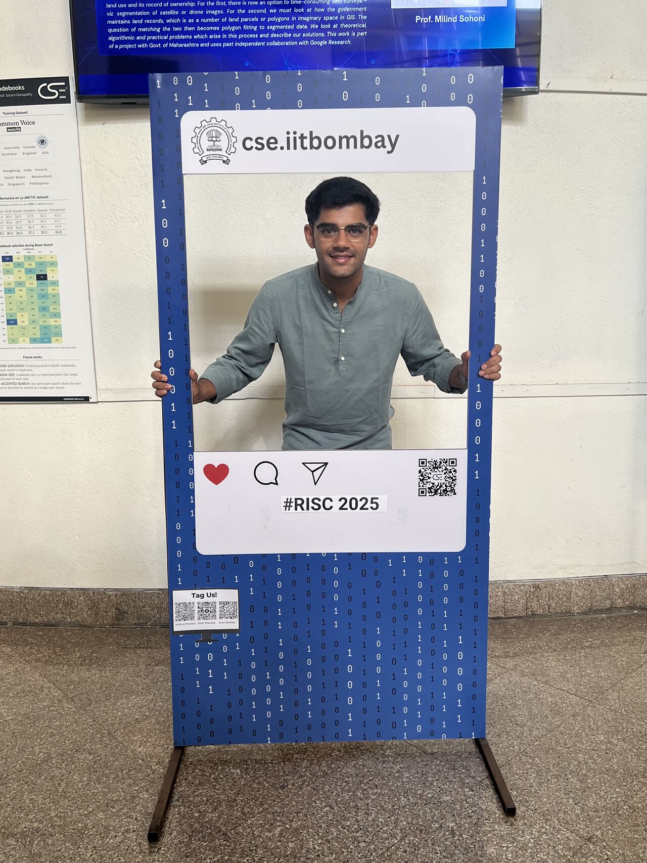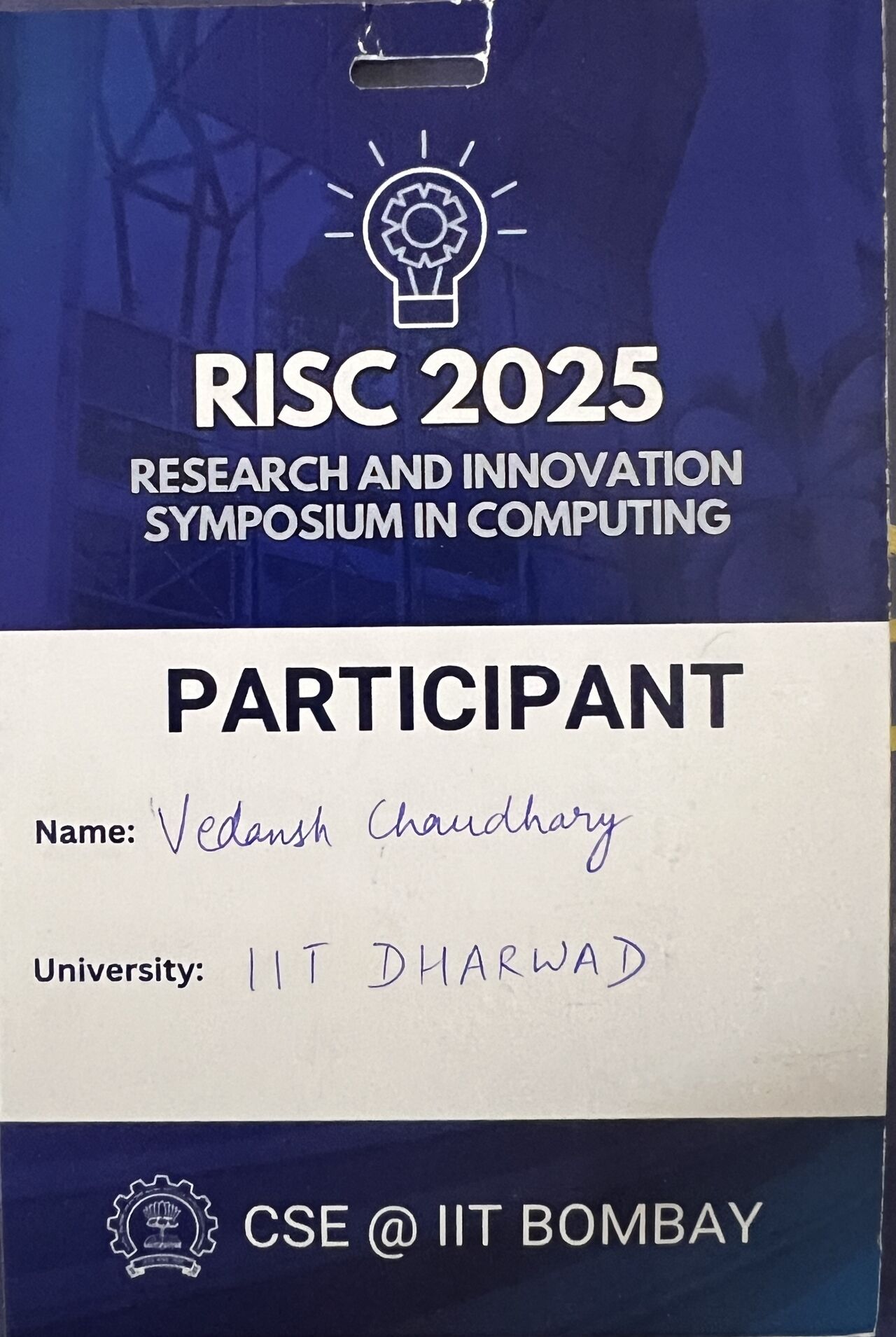 Mr. Vedansh Chaudhary, a student from the Department of Mathematics, IIT dhArwAD, participated in the prestigious Research and Innovation Symposium in Computer Science (RISC 2025), organized by the Department of Computer Science and Engineering at IIT Bombay.