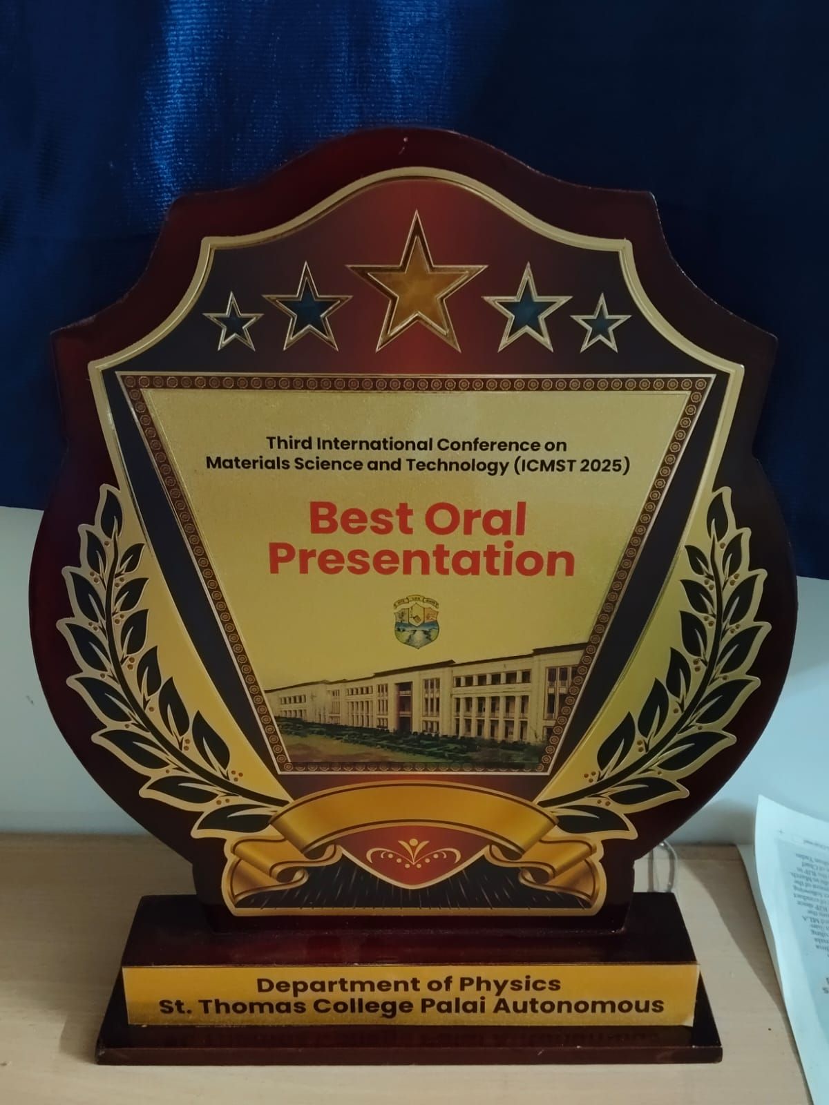 Ms. Debajani Rout, a PhD student under the supervisor of Prof. Santosh Kumar, Department of Physics, received the award for best oral presentation in the third international conference on Materials Science and Technology (ICMST 2025).