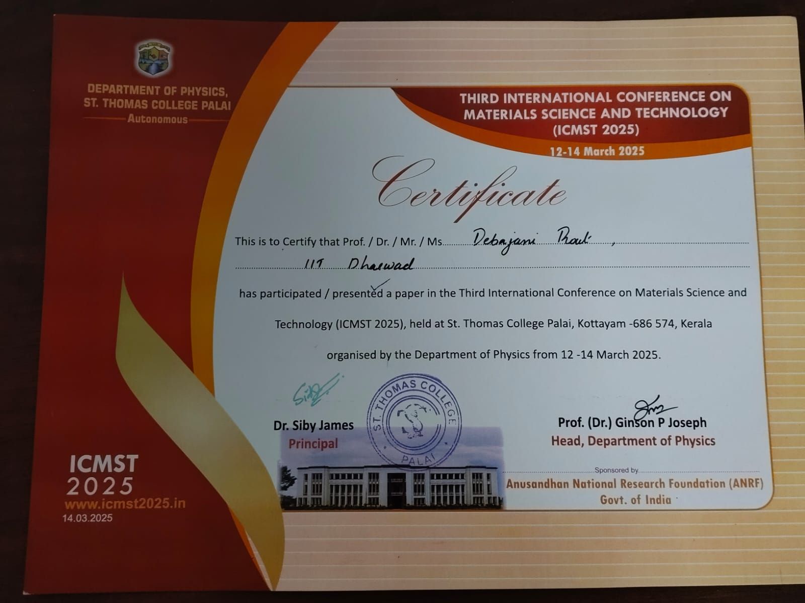 Ms. Debajani Rout, a PhD research scholar at IIT dhArwAD under the supervision of Prof. Santosh Kumar, participated in the 3rd International Conference on Materials Science and Technology, held from 12th to 14th March 2025 at St. Thomas College, Pala, Kottayam, Kerala, with an oral presentation on "Single Crystal Growth of Rare-Earth Carbide YCoC₂."