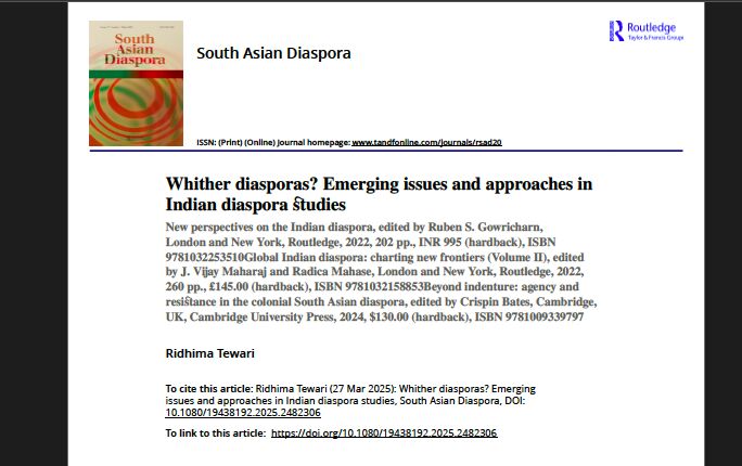 Prof. Ridhima Tewari's paper has been published in the journal "South Asian Diaspora", a Q1 journal published by the Taylor and Francis/Routledge group. The long essay titled "Whither diasporas? Emerging issues and approaches in Indian diaspora studies", examines recent scholarship from the field of diaspora studies to establish a new methodological framework coming into force in the domain today. The essay engages with works of seminal contributors to the field of contemporary South Asian diaspora studies, highlighting a shift in unpacking diasporic issues and identities today.