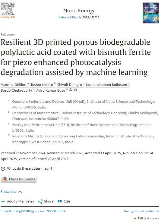 A research article co-authored by Mr. Tushar Moitra, published in Nano Energy (Elsevier, Impact Factor: 17) [https://lnkd.in/ds5BMwzY], has been acknowledged for its breakthrough in AI- and nanotechnology-driven water purification. The work was recognized by the Department of Science and Technology (DST), Government of India, and featured in multiple media outlets, including The Tribune and The Indian Express. The research and the lab were also endorsed by renowned chemist Dr. D.D. Sarma.