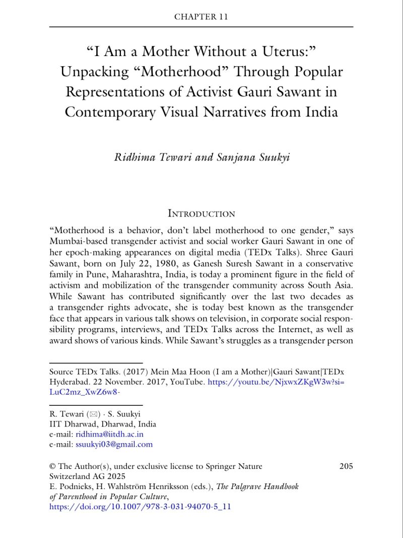We are pleased to announce that PRof Ridhima Tewari, Associate Professor, HEART Department, and Ms Sanjana Suukyi M P, Research Scholar, HEART Department, have published a book chapter titled “I Am a Mother Without a Uterus:” Unpacking “Motherhood” Through Popular Representations of Activist Gauri Sawant in Contemporary Visual Narratives from India. The chapter appears in The Palgrave Handbook of Parenthood in Popular Culture, published by Springer Nature (2026).