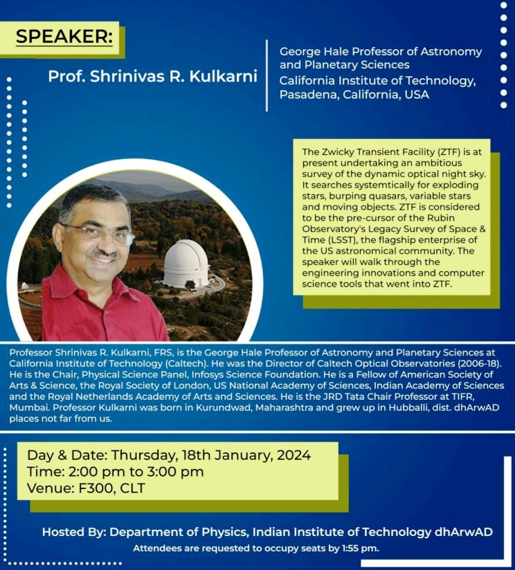 The Indian Institute of Technology (IIT) DhArwAD successfully conducted its 5th Colloquium on January 18, 2024, with a keynote address by the esteemed Prof. Shrinivas R. Kulkarni. An acclaimed astronomer and academic, Prof. Kulkarni hold multiple prestigious positions, including the George Hale Professor of Astronomy and Planetary Sciences at the California Institute of Technology, Chair of the Physical Science Panel at the Infosys Science Foundation, and the JRD Tata Chair Professor at the Tata Institute of Fundamental Research, Mumbai.