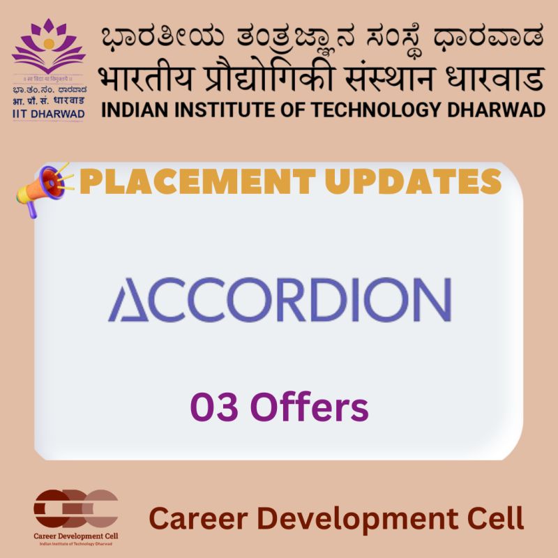 Congratulations to the bright minds of IIT Dharwad who secured job offers from Accordion through the campus placement drive organized by Career Development Cell. Your success is well-deserved!