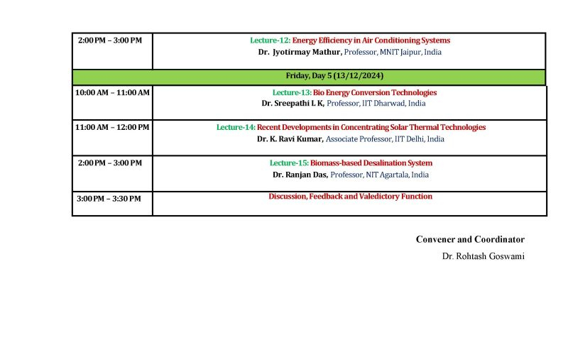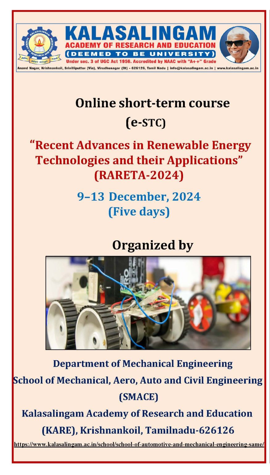 Dr. Sreepathi L K delivers session on Bio Energy Conversion Technologies. Dr. Sreepathi L K, Visiting Professor at IIT dhArwAD, was invited as a speaker during the online short-term course (eSTC) Recent Advances in Renewable Energy Technologies and their Applications (RATETA-2024), hosted by Kalasalingam Academy of Research and Education (KARE), Krishnankoil, Tamilnadu, on 13th December 2024. He delivered the lecture on "Bio Energy Conversion Technologies." The workshop aimed to provide participants with an overview of recent advanced technologies developing from renewable energy sources for different applications and their benefits/role in climate change as well as emission reduction.