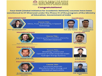 We are pleased to announce that four GIAN (Global Initiative for Academic Network) courses have been sanctioned to IIT Dharwad under Phase IV of the Ministry of Education, Government of India.