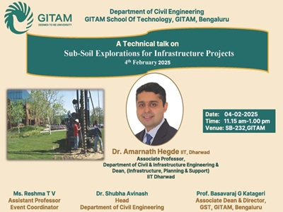 Prof. Amarnath Hegde delivered an invited talk on the topic of “Sub-Soil Exploration for Infrastructure Projects” at the Department of Civil Engineering, GITAM School of Technology Bengaluru, on 4th February 2025.
