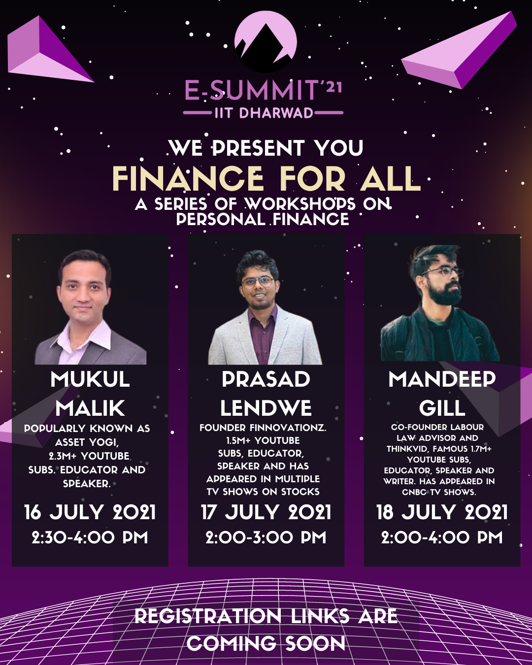 E-Summit'21 is the first entrepreneurial fest hosted by IIC, IIT Dharwad. Featuring well-known personalities, competitions, quizzes, amazing prizes, and much more. E-Summit will provide an insight into many things, empowering students to foster and nurture their creative ideas, innovations, and unique talents.