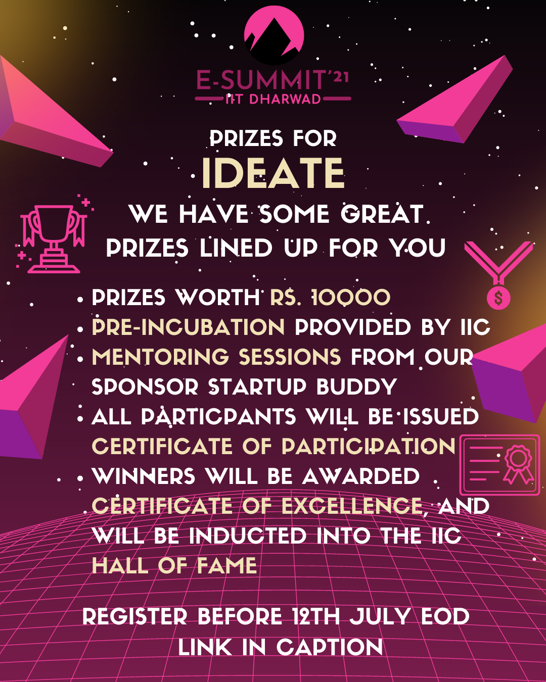The Institute Innovation Council is on its way to host IIT Dharwad’s very first entrepreneurial fest “E-Summit 2021”, featuring well-known personalities who will provide an insight into many things, empowering students to foster and nurture their creative ideas, innovations, and unique talents.Get ready for three days of fun whilst being productive, take part in competitions, quizzes, amazing prizes, and much more, it'll be an engaging and competitive experience.