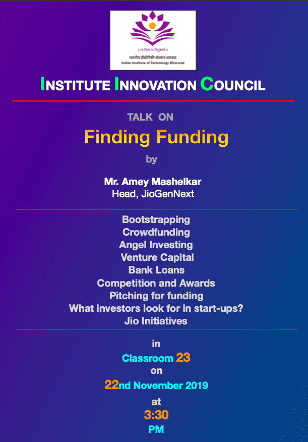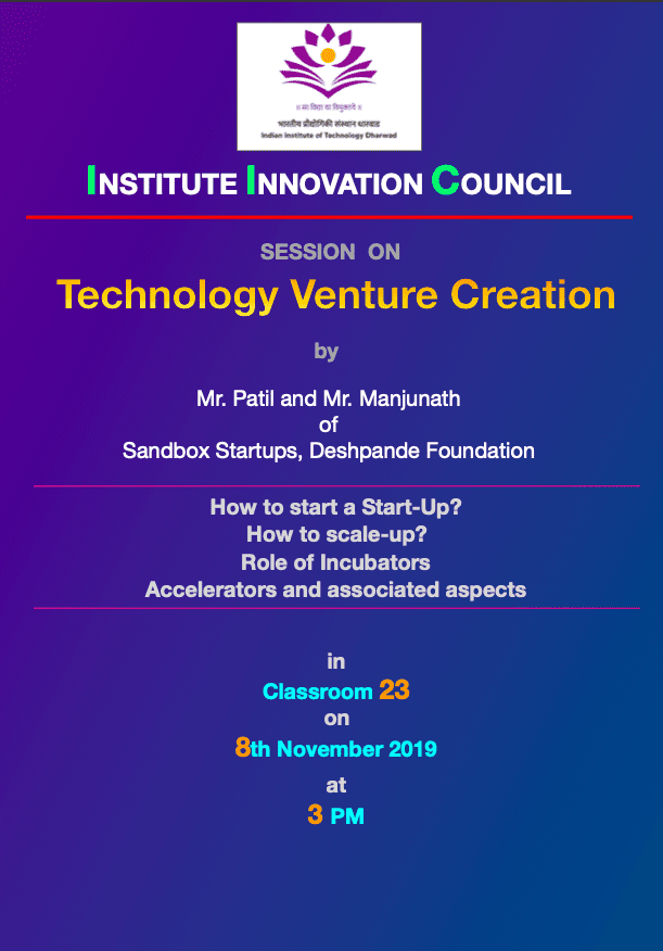 Institute Innovation Council (IIC) of IIT Dharwad is established to conduct various innovation and entrepreneurship related activities, and to systematically foster the culture of innovation in IIT Dharwad. Towards this aim it organises workshops, hackathons, seminars and arranges interactions with entrepreneurs, investors and professionals. It also works towards creation of a mentor pool for student innovators and envisages to develop a network with peers and national entrepreneurship development organisations. The council presently consists of 41 student members, headed by Prof. Raj Hirwani as the President, with Prof. Amar Gaonkar being the Convener.