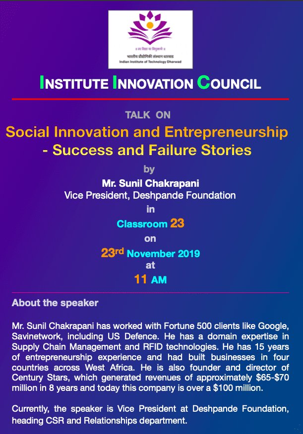 Mr. Sunil Chakrapani has worked with Fortune 500 clients like Google, Savinetwork, including US Defence. He has a domain expertise in Supply Chain Management and RFID technologies. ...He has 15 years of entrepreneurship experience and had built businesses in four countries across West Africa. He is also founder and director of Century Stars, which generated revenues of approximately $65-$70 million in 8 years and today this company is over a $100 million. Currently, the speaker is Vice President at Deshpande Foundation, heading CSR and Relationships department.