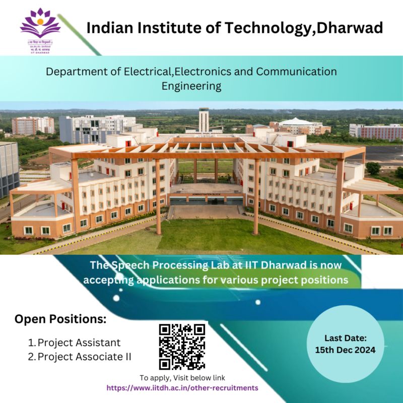 Indian Institute of Technology Dharwad is currently inviting applications for a range of project positions in the Speech Processing Lab led by Prof. Mahadeva Prasanna. This opportunity is an ideal for those interested in progressing their careers in Speech and AI, and acquiring practical experience in innovative projects. For further details on the available positions and how to apply,