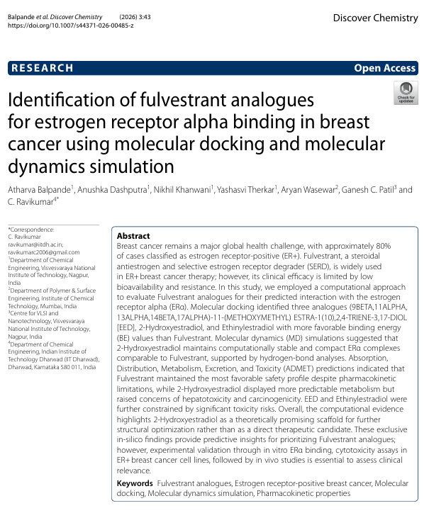 PRof. Ravikumar C and his team published a research article titled 'Identification of Fulvestrant Analogues for Estrogen Receptor Alpha Binding in Breast Cancer Using Molecular Docking and Molecular Dynamics Simulation' in the journal ' Discover Chemistry (Springer Nature), 3, 43, 2026'C.
