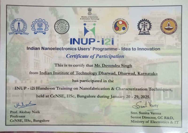 As part of this program, Mr. Devendra attended a specialized workshop on the Fabrication and Characterization of Semiconductor Materials at IISc Bangalore. This opportunity provided him with hands-on experience and deepened his knowledge in the field of semiconductor technologies.