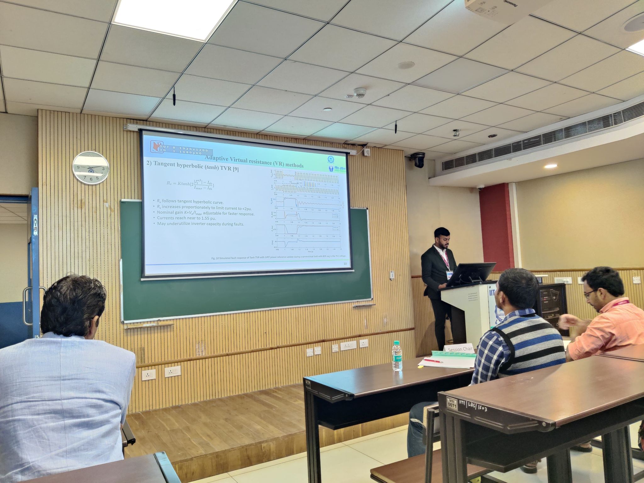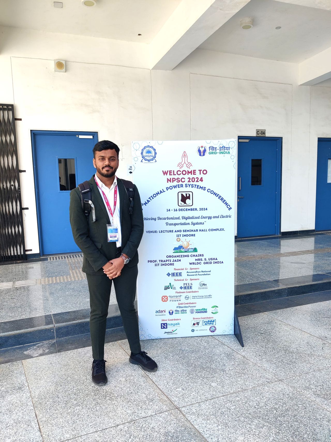Mr. Jack Benjamin, an MS research scholar at IIT Dharwad, working under the guidance of Dr. Pratyasa Bhui and Dr. Animesh Sahoo, Ph.D., presented his research titled "Enhanced Fault Current Utilization by Grid-Forming Inverter Using Non-Linear Transient Virtual Resistance During Symmetrical Faults" at the 23rd National Power Systems Conference (NPSC) 2024, held at Indian Institute of Technology, Indore from December 14–16.  The study focuses on maximizing fault current injection near the inverter's maximum current capability during symmetrical short circuit faults. During the conference, Mr. Benjamin also engaged in meaningful interactions with academic peers, fellow researchers, and industry professionals, fostering valuable connections and knowledge exchange.