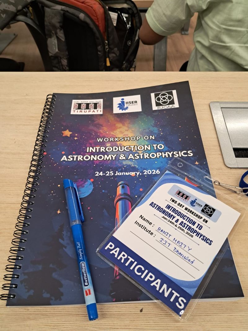 Mr. Ranit Maity, a 2nd-year B.Tech student in Mechanical Engineering, participated in the Workshop on Introduction to Astronomy and Astrophysics held on 24–25 January 2026 at IIT Tirupati, in collaboration with IISER Tirupati and IUCAA Pune.