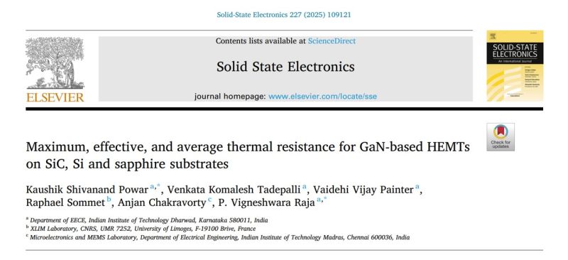 M.Tech project work of Mr. Kaushik Powar and Mr. Venkata Komalesh Tadepalli, entitled "Maximum, effective, and average thermal resistance for GaN-based HEMTs on SiC, Si and sapphire substrates" has been published in Solid-State Electronics. This work is carried out in collaboration with IIT Madras and XLIM Lab France. The computed thermal resistance values are useful for heat-sink design and compact modeling. This work benefited by the Sentaurus TCAD access provided through the MeitY Chips-to-Startup (C2S) project led by Prof. Nagaveni S, IIT Dharwad. The article can be downloaded from this share link: https://lnkd.in/deQmxMRH