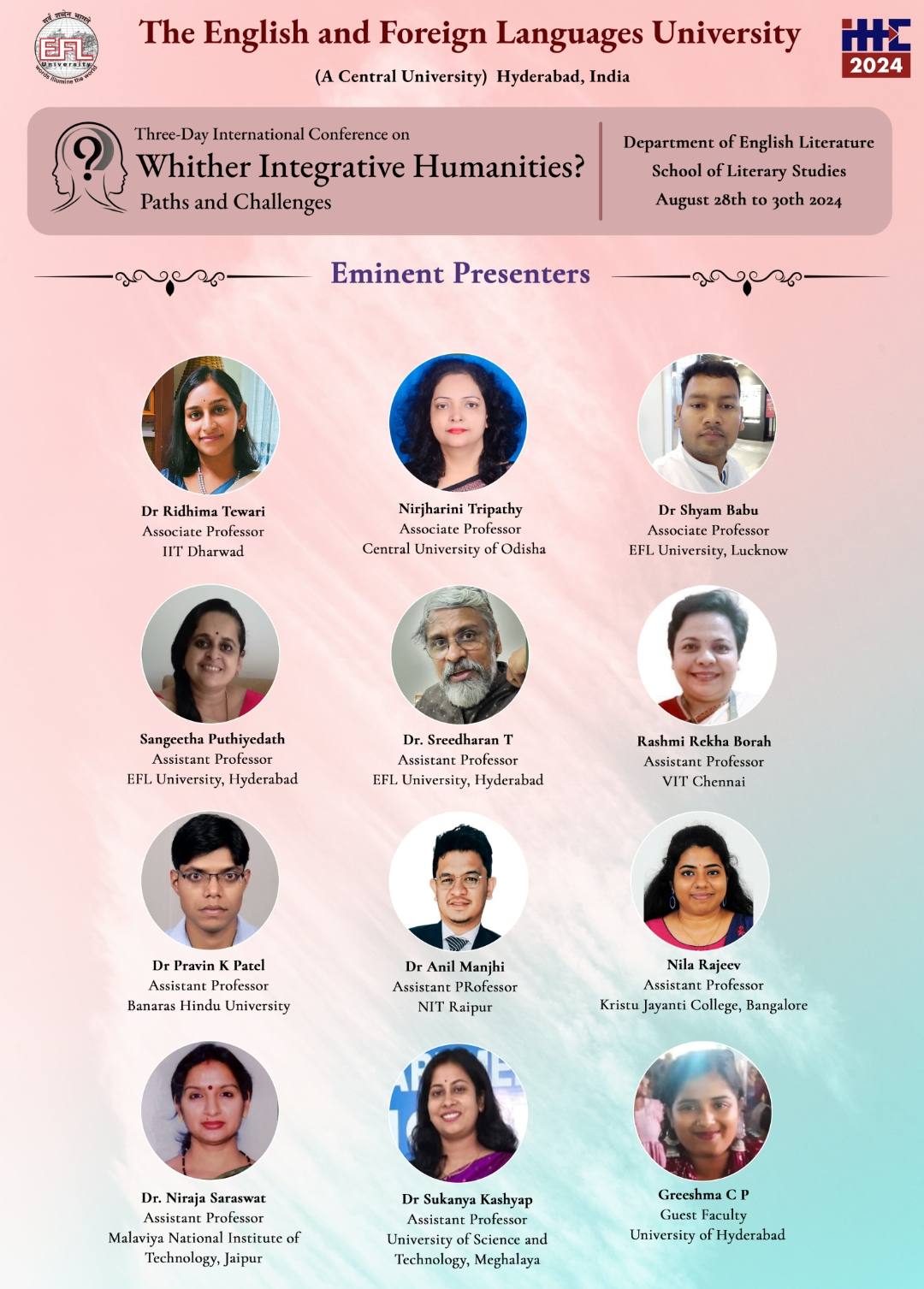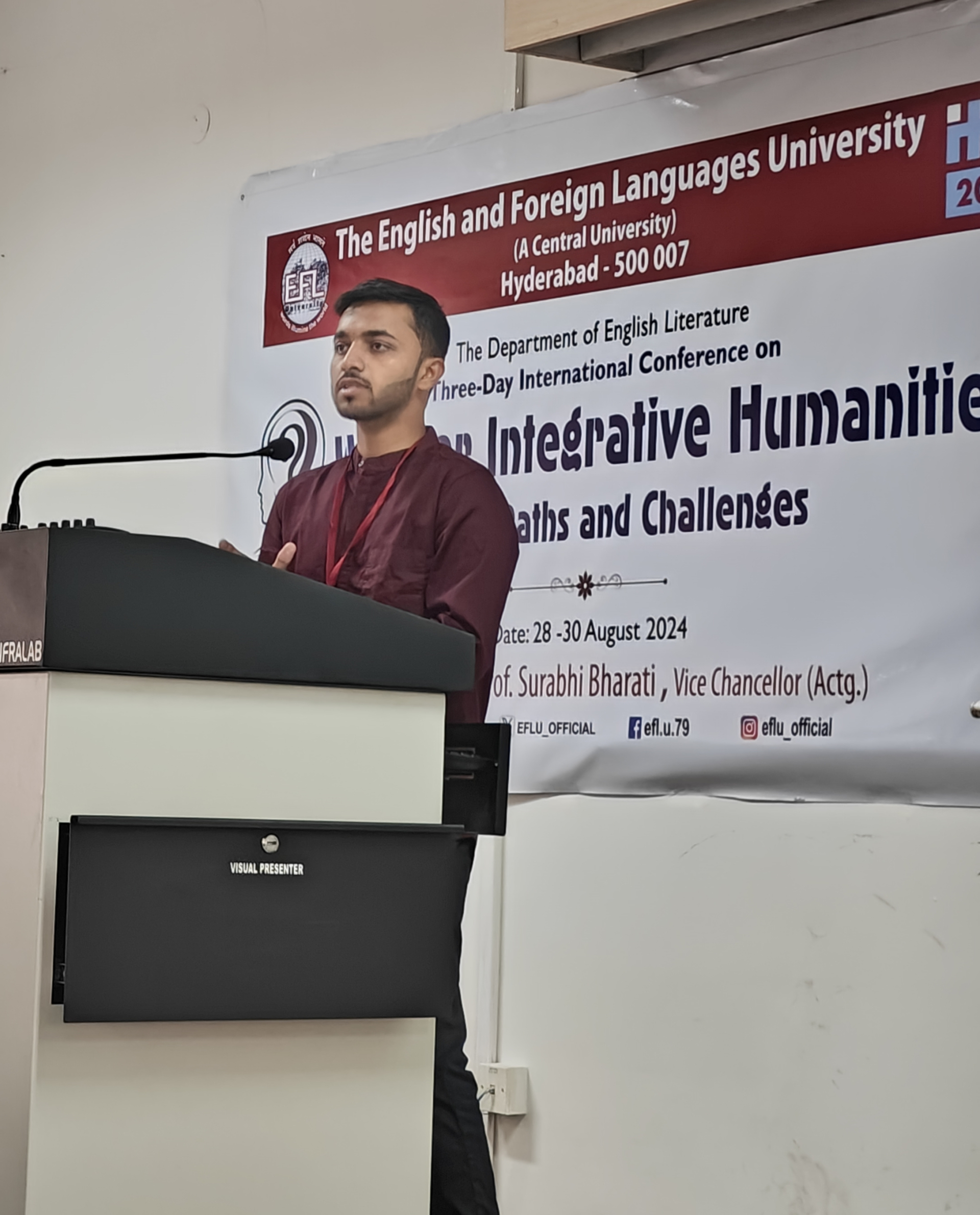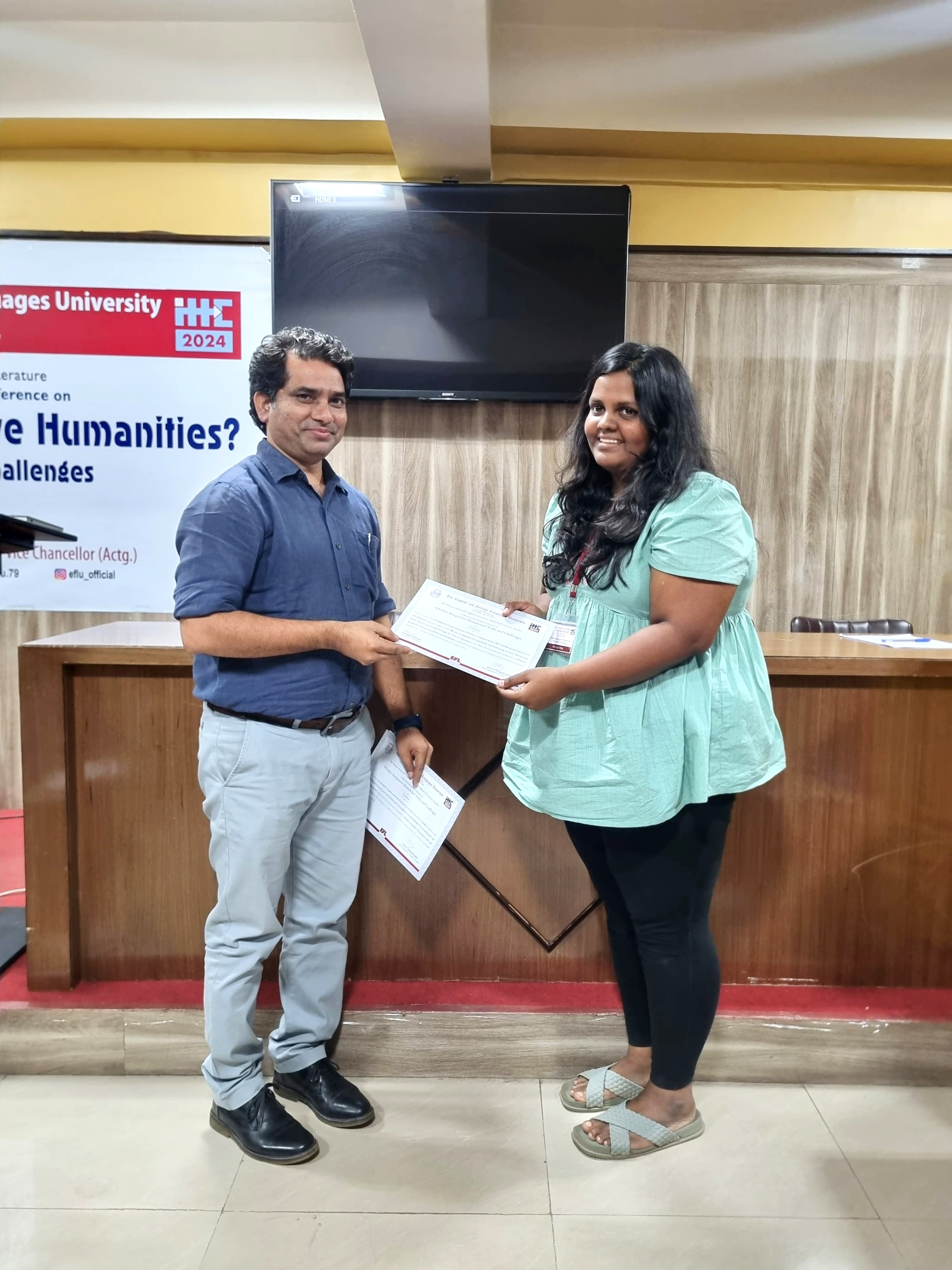 Prof. Ridhima Tewari's research group from the field of English Literary Studies made two well-received presentations at the International Conference on 'Whither Integrative Humanities' organised by the English and Foreign Languages University Hyderabad. Prof. Tewari's PhD students Ms Sanjana Sukyii and Mr Tajuddeen Nadaf co-presented their works along with Prof. Tewari. The conference included presenters from various IITs including IIT Kanpur, IIT Roorkee, IIT Hyderabad, to name a few. Prof. Tewari was also listed as an eminent speaker for the event.