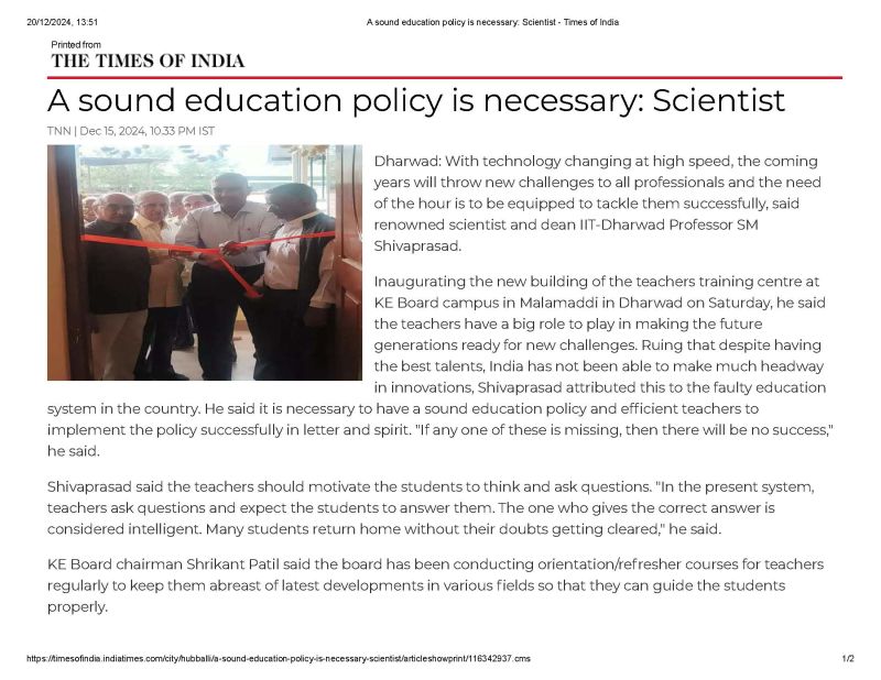 Prof. SM Shivaprasad, Dean Outreach inaugurated the new teachers' training center at KE Board campus, Dharwad. In his address, he stressed the need for a sound education policy to equip future generations to tackle the rapid advancements in technology. He emphasized that teachers play a pivotal role in preparing students for these challenges and highlighted the importance of motivating students to think critically and ask questions.