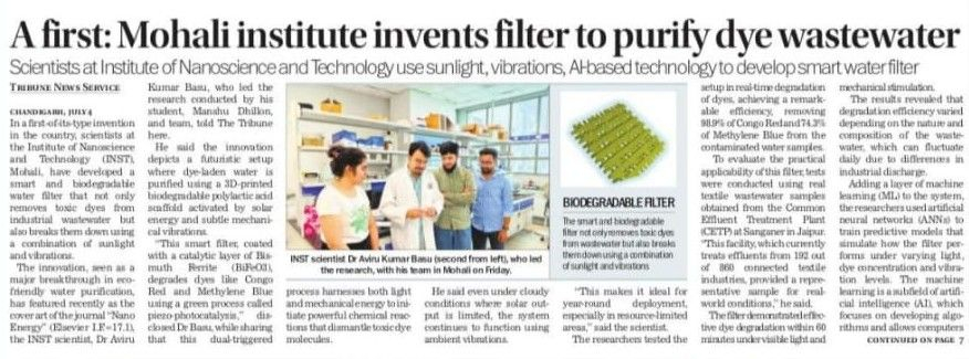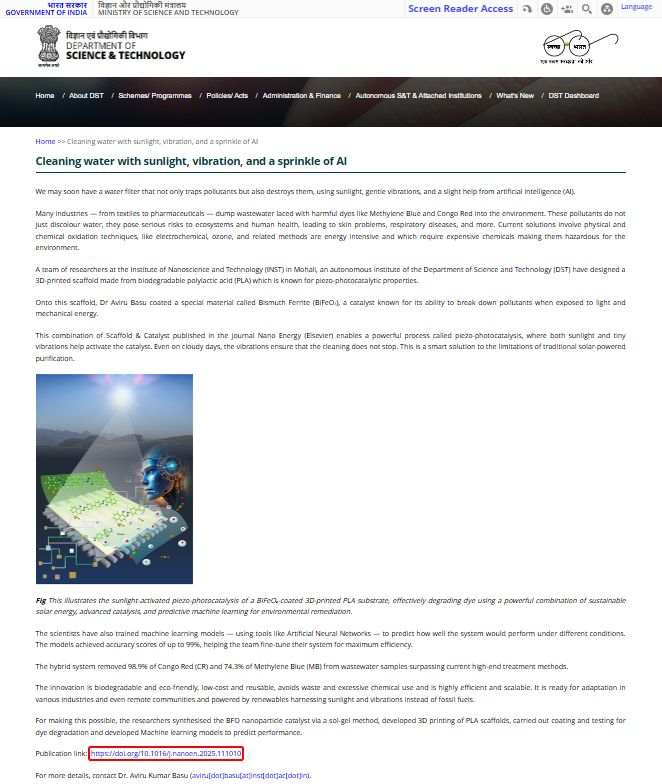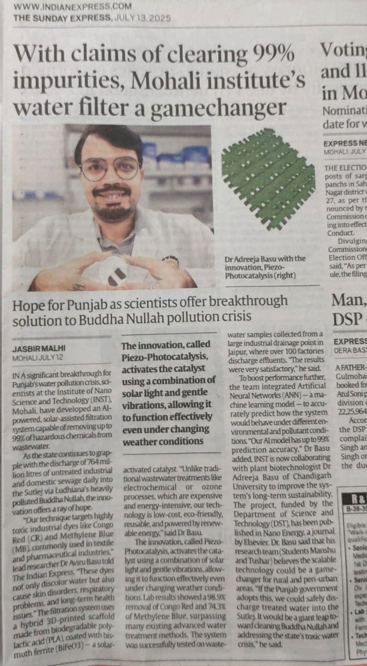 A research article co-authored by Mr. Tushar Moitra, published in Nano Energy (Elsevier, Impact Factor: 17) [https://lnkd.in/ds5BMwzY], has been acknowledged for its breakthrough in AI- and nanotechnology-driven water purification. The work was recognized by the Department of Science and Technology (DST), Government of India, and featured in multiple media outlets, including The Tribune and The Indian Express. The research and the lab were also endorsed by renowned chemist Dr. D.D. Sarma.