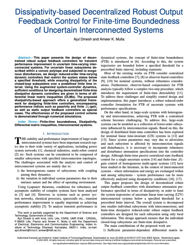 We are proud to share that Prof. Ameer Mulla from the Department of Electrical, Electronics and Communication Engineering, IIT Dharwad, has co-authored a research article titled: "Dissipativity-based Decentralized Robust Output Feedback Control for Finite-time Boundedness of Uncertain Interconnected Systems"