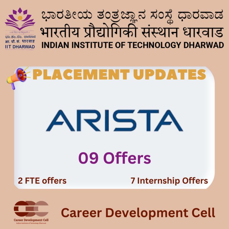 We are happy to share that talented students of Final Year and Pre Final Year from IIT Dharwad have secured job offers and internship offers from Arista Networks through our recent campus placement drive organized by the Career Development Cell.